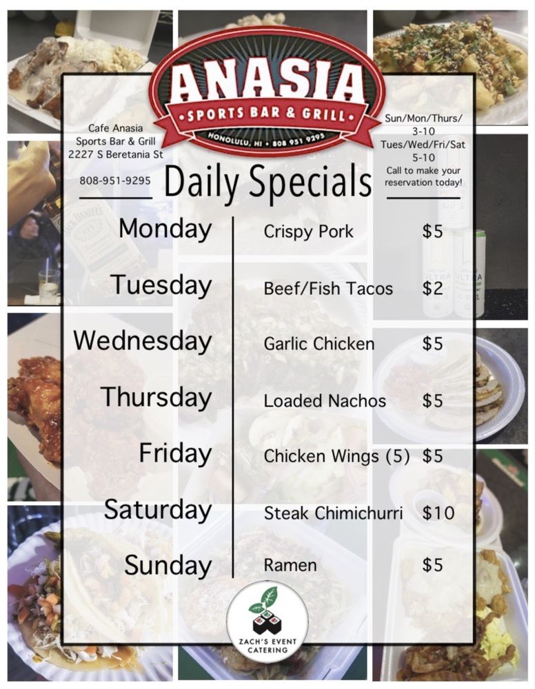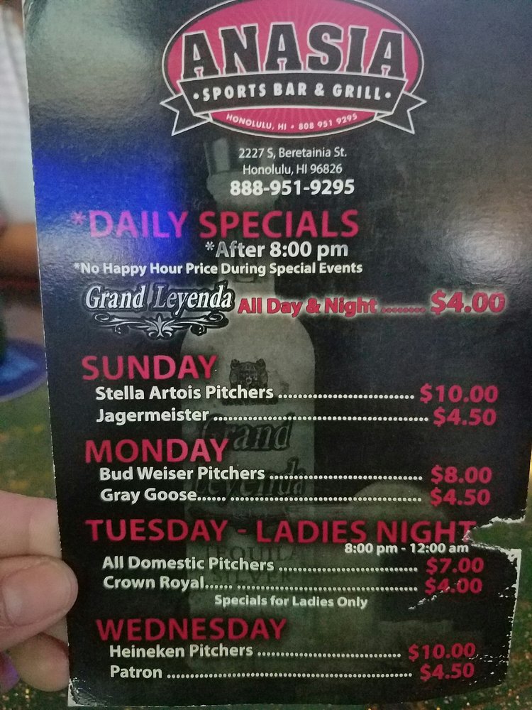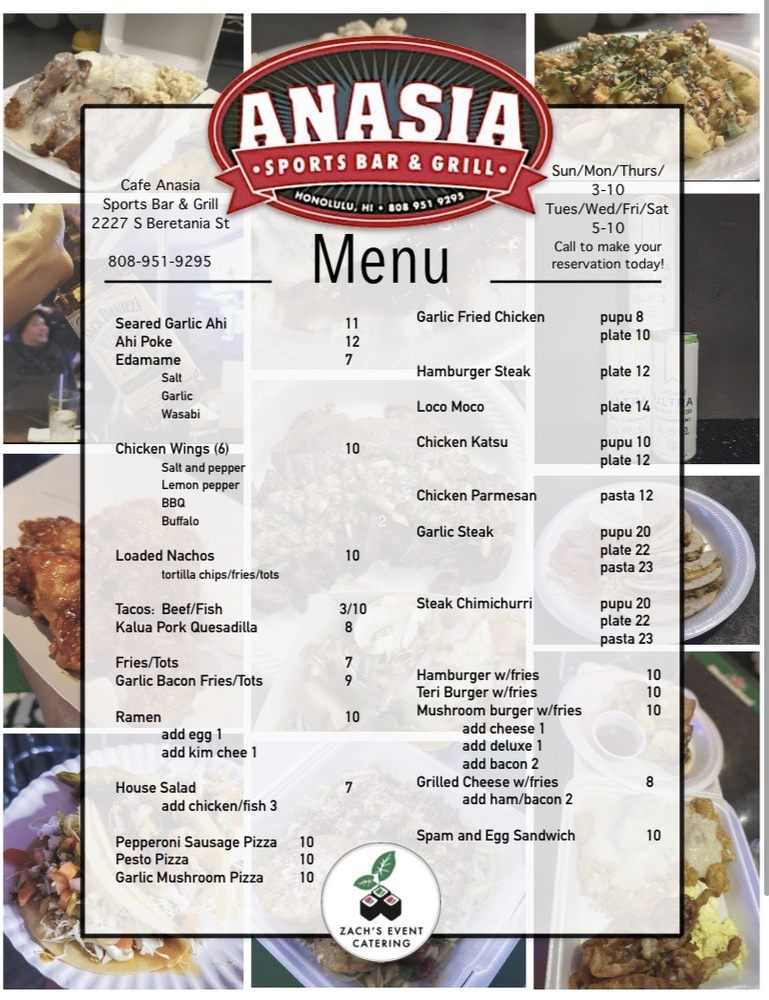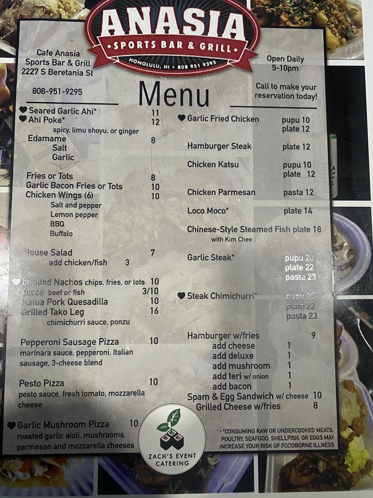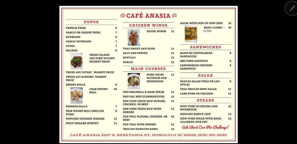 "Café Anasia" in Honolulu offers a mix of Vietnamese cuisine with a casual atmosphere, perfect for groups and late-night dinners. The menu features a variety of dishes, from burgers like BLT Cheeseburger and Spicy Chicken Sandwich to Plates like Chicken Katsu and Shrimp Pesto Pasta. The cozy restaurant/bar has been praised for its friendly staff, delicious food, and affordable prices. Customers have raved about the TV monitors for watching games, the pool tables and dartboards for entertainment, and the jukebox with a vast selection of songs. The bar also offers happy hour specials, full bar service, and outdoor seating. Overall, "Café Anasia" is a hidden gem with a fun and lively atmosphere, making it a must-visit spot for locals and tourists alike.